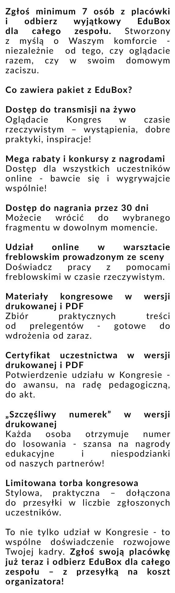 To nie tylko udział w Kongresie - to wspólne doświadczenie rozwojowe Twojej kadry. Zgłoś swoją placówkę już teraz i odbierz EduBox dla całego zespołu – z przesyłką na koszt organizatora!